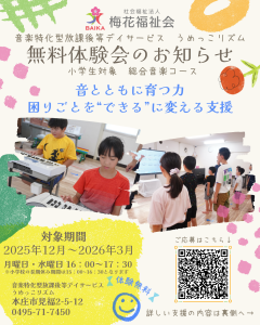 音楽特化型放課後等デイサービス うめっこリズムでは、本庄市でADHDや自閉症など、様々な障害をお持ちの小学生のお子様に、音楽と運動を取り入れた独自の療育プログラムを展開しております。
