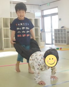 「手押し車」では、お友達と力を合わせながら、体幹をしっかり使って進んでいきます。「カラーボール運び」では、直線コースをダッシュしたり、うさぎ歩きやくま歩きに変身したりしながら、ボールを運びます。汗をかくほど元気いっぱい身体を動かし、コツを掴んだ時の笑顔が忘れられません☆