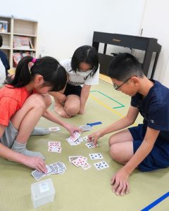 休み時間には、「休み時間スペースで座って遊ぶ」というルールを設けています。そのルールの中で、カードゲームや本、おもちゃなど、それぞれが好きな遊びを楽しんでいます。