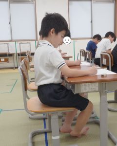 背筋をピンと伸ばし、足をピタッと揃えた姿勢で取り組めている瞬間に沢山褒めて、成功体験として記憶してもらえるような声かけを意識しています。正しい姿勢を習慣づけることで、自然と良い姿勢になっている子も増えてきています。